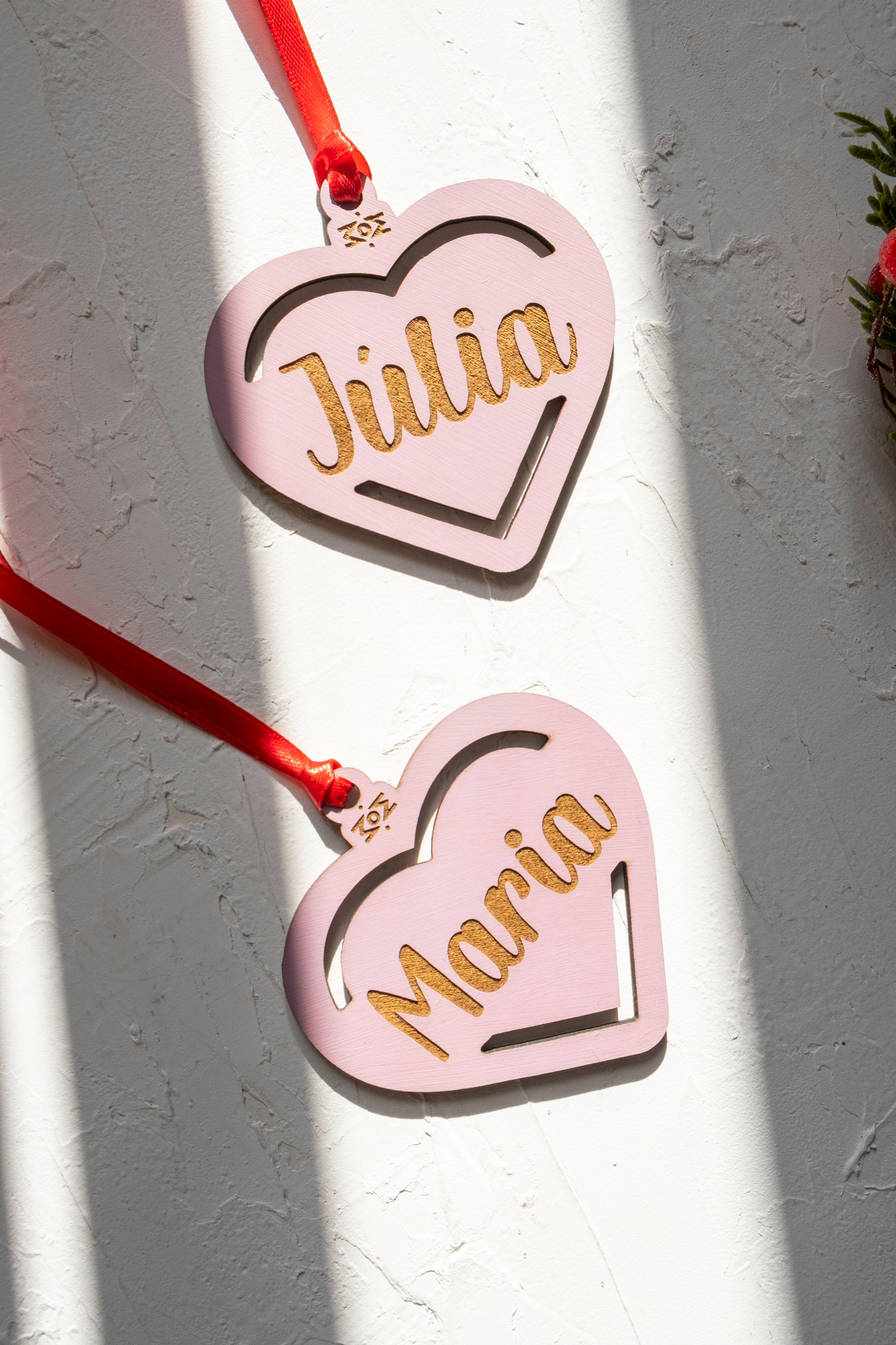 Diseño único: Diseños navideños con nombre en troquel o grabado según el modelo. Círculo con lazo, círculo, corazón, hexágono, corazón grabado, mini arbolito de Navidad con banda grabada y estrella.