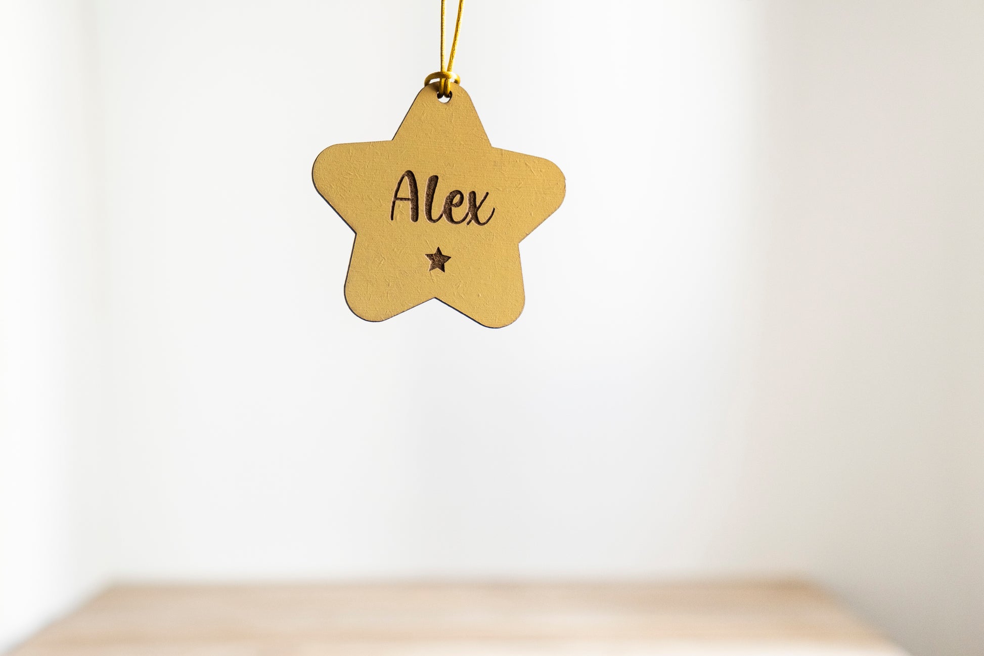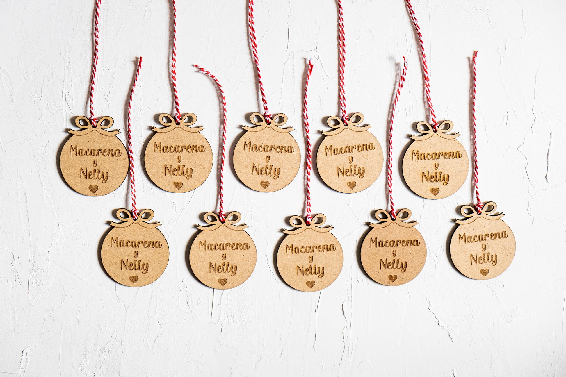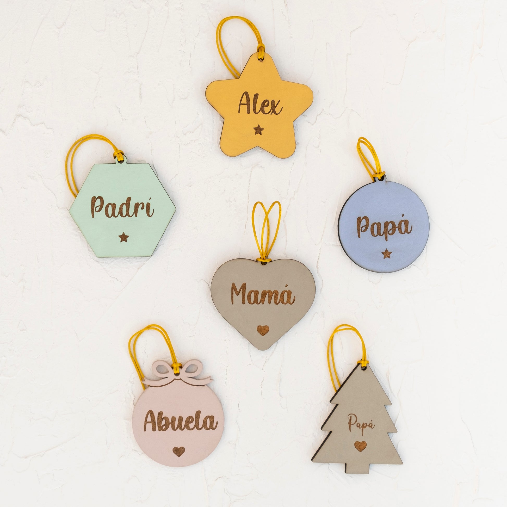 Diseño único: Estrellita redondeada, hexágono, corazón, círculo círculo con lazo o mini arbolito de Navidad, con detallito grabado bajo el nombre.