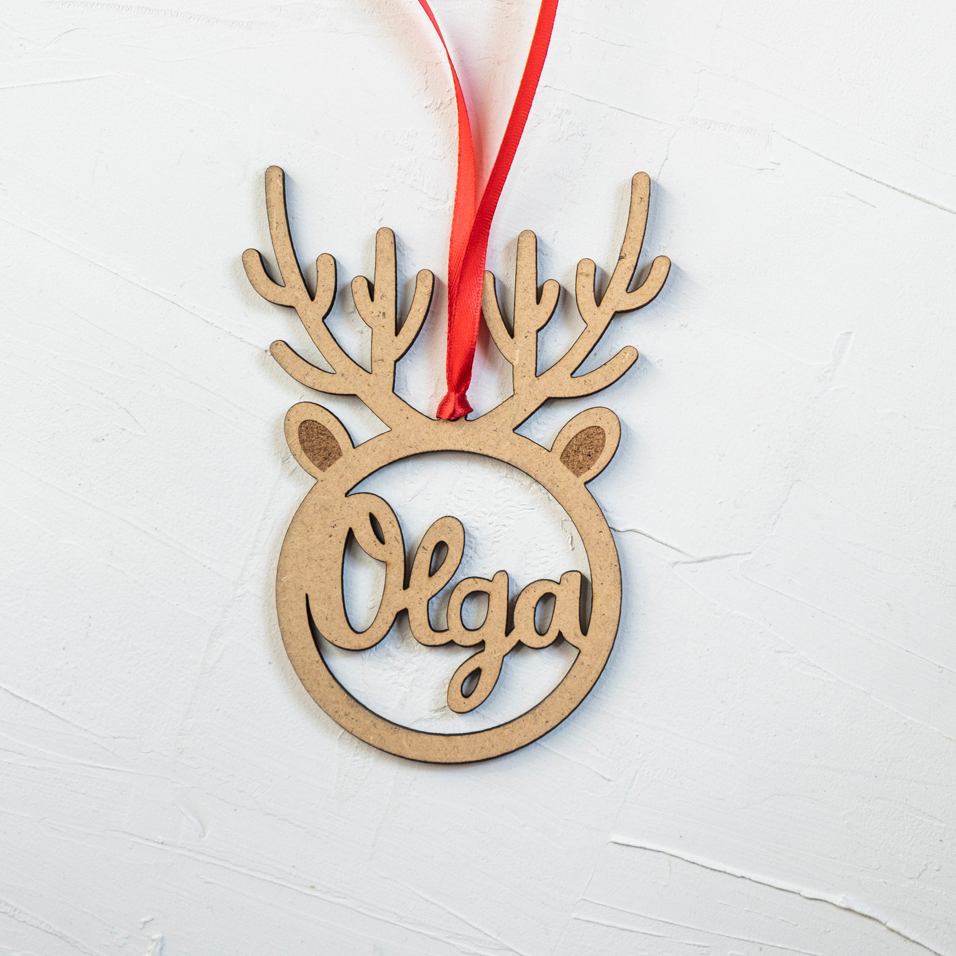 Diseño único: Adorable aro de reno con orejitas y cuernos y el nombre a troquel en el centro