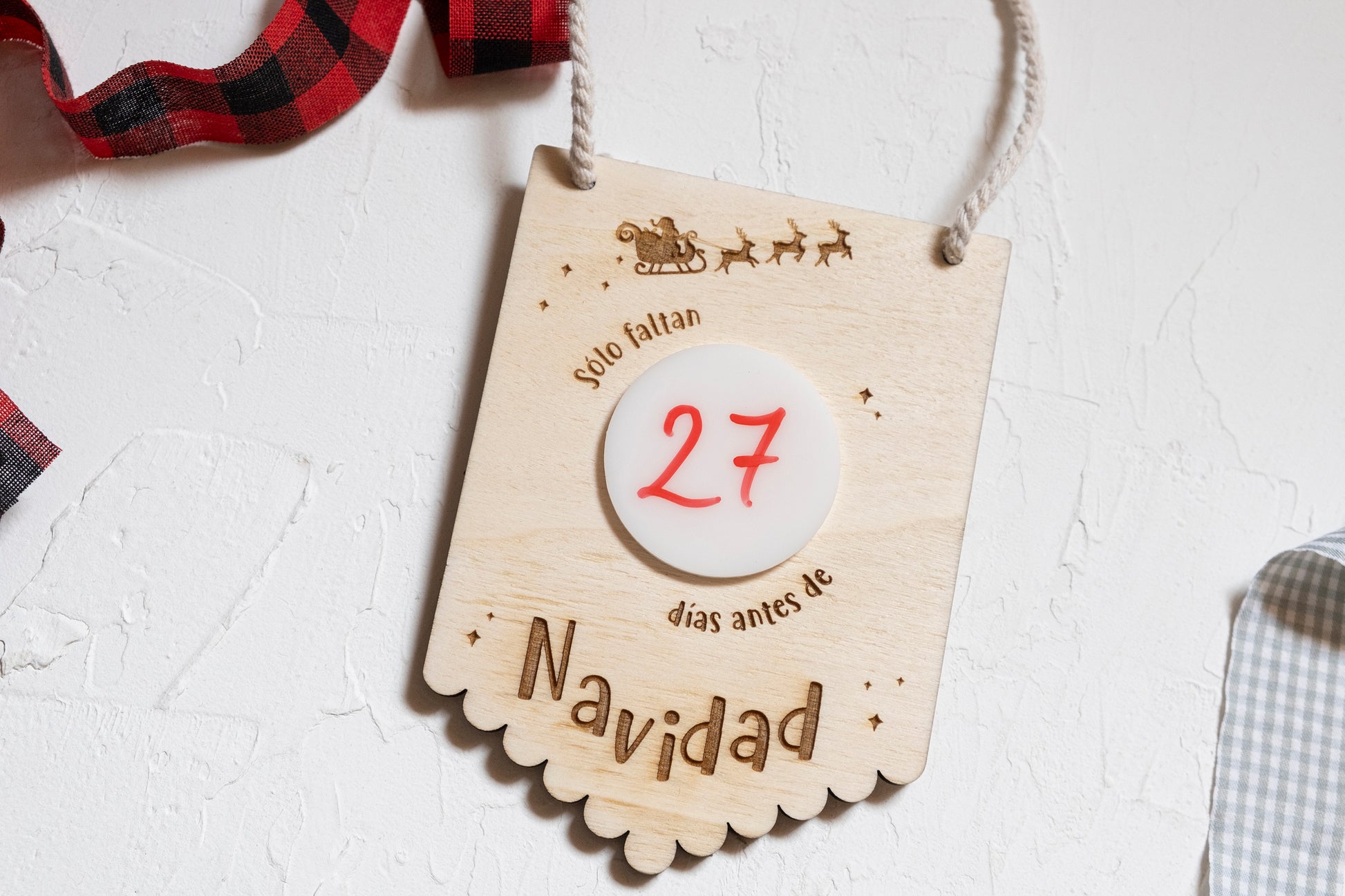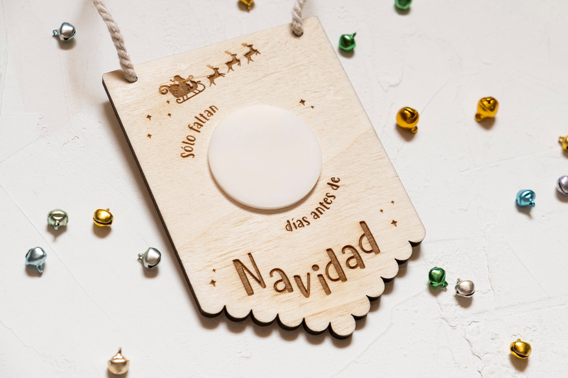 Diseñado en dos piezas, este cartelito colgante, combina una base de madera en forma de banderola festoneada con un círculo acrílico personalizable para anotar los días que faltan hasta Navidad, puedes elegir entre los distintos diseños con un ciervo, muérdago o con Papá Noel y sus renos volando grabados sobre el fondo.