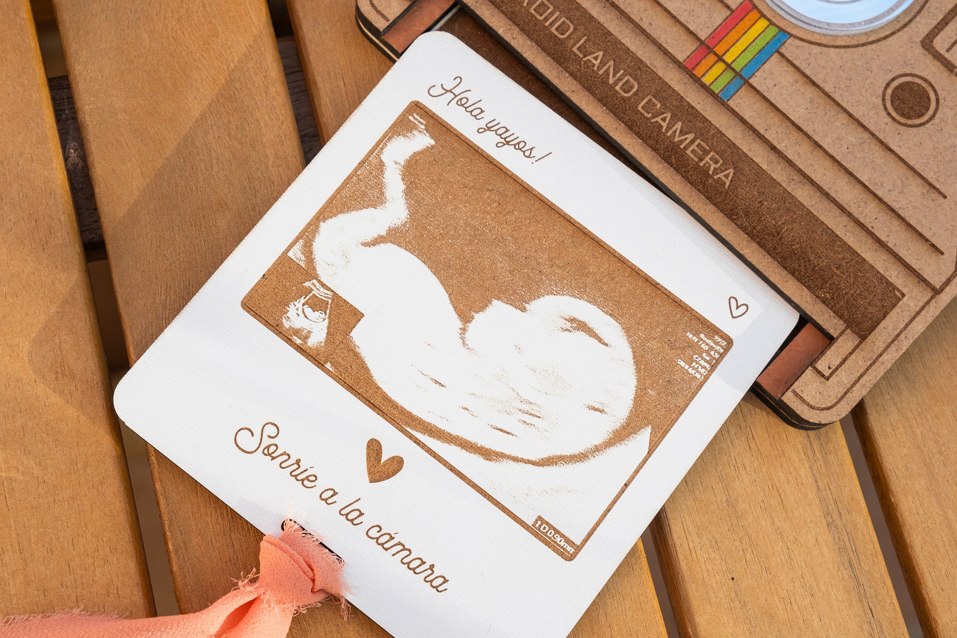 Cajita en forma de cámara retro (Polaroid 1000) con detalle de color y objetivo en metacrilato espejo. En su interior, fotografía polaroid en blanco con mensajes, ecografía y cinta de color para tirar.