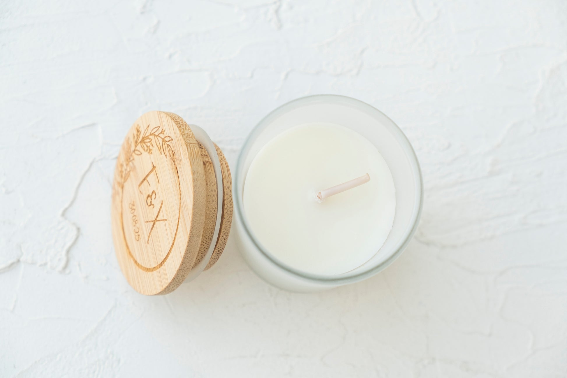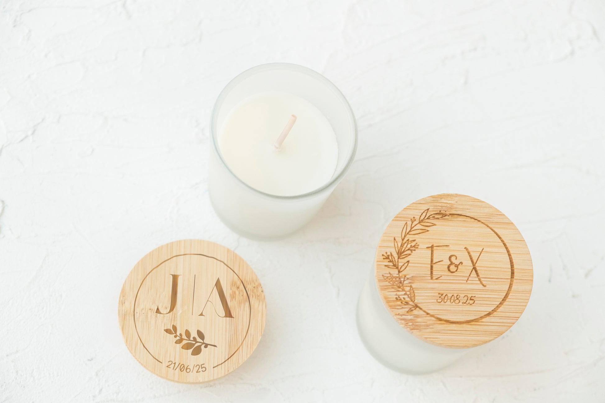 Diseño único: Vela blanca en vasito de cristal con tapa de bambú personalizada