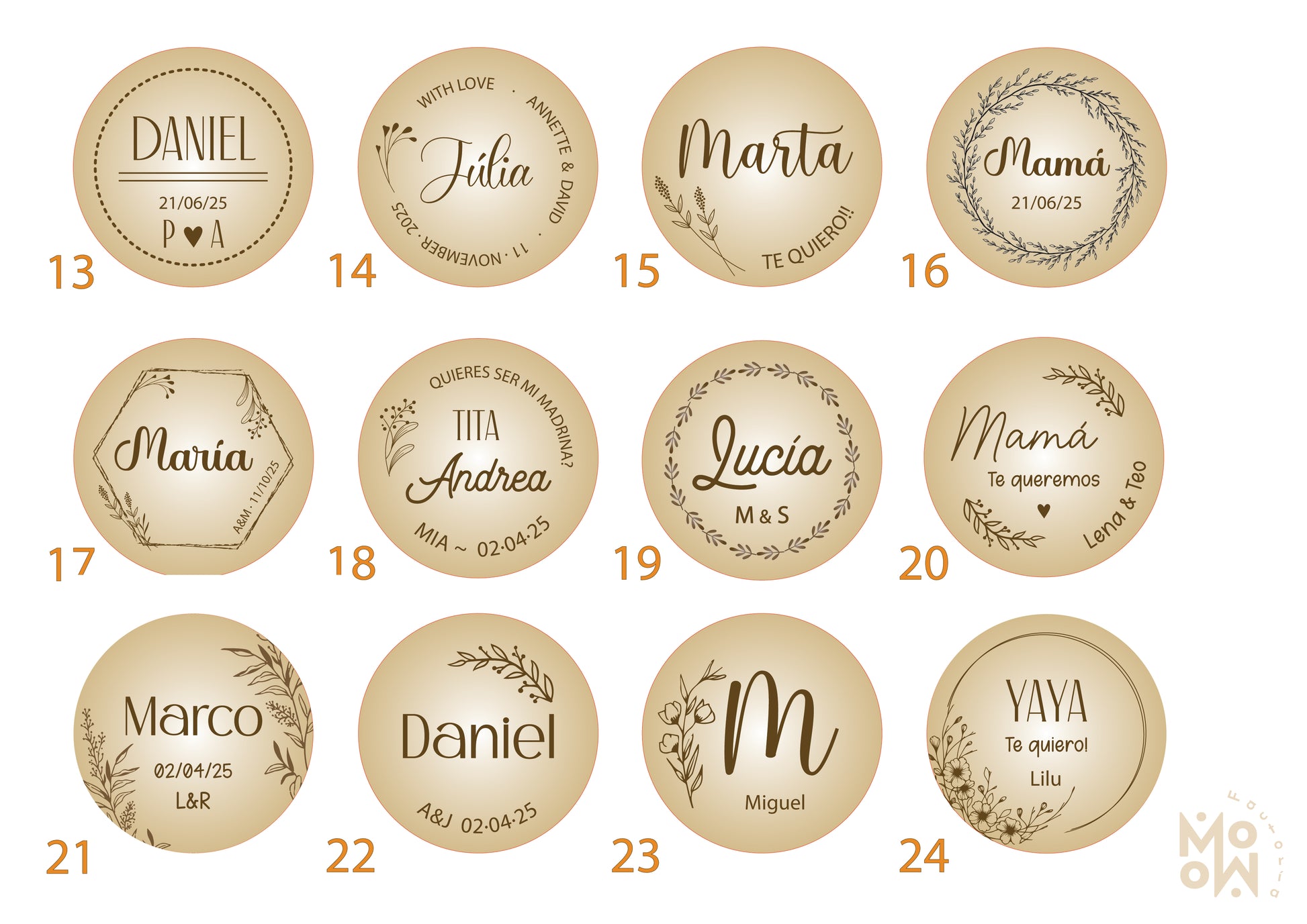 Detalle delicado, sencillo y resultón. Es reutilizable ya que son de cristal y la tapita de bambú viene grabada con los detalles y diseño elegidos.